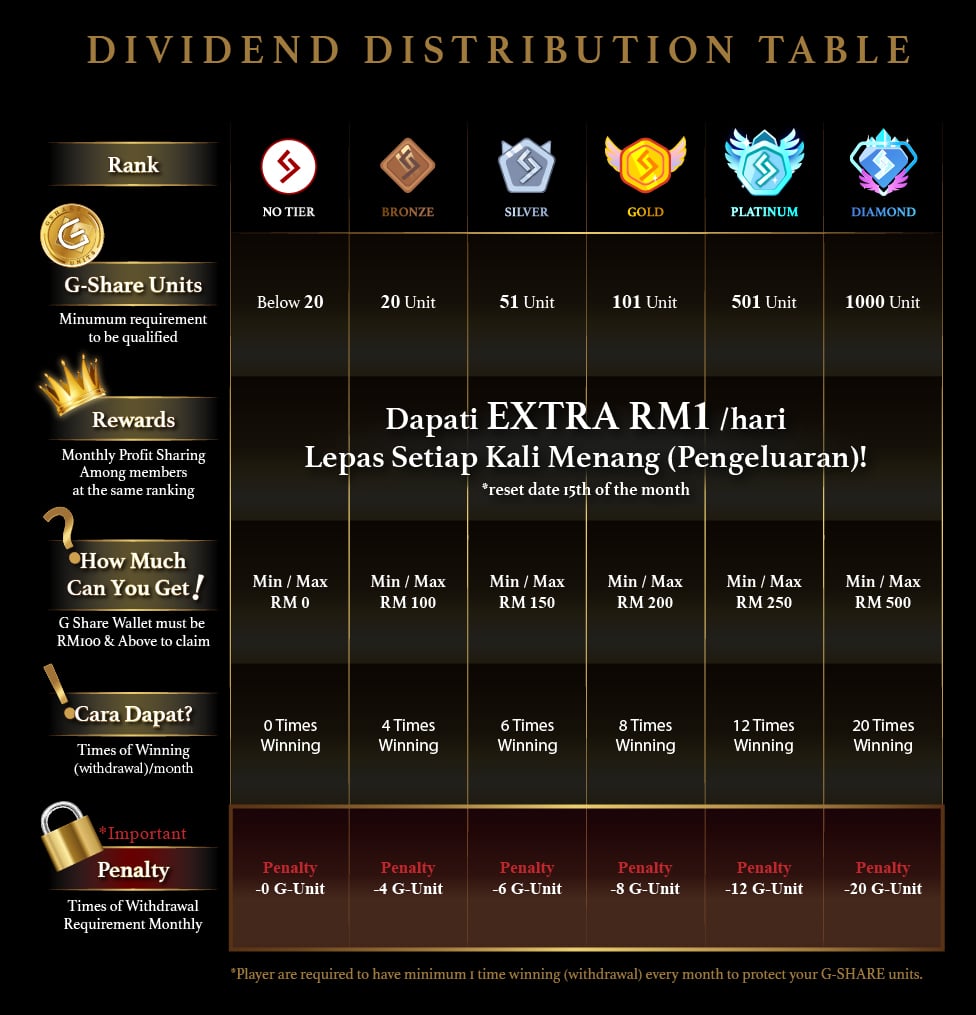 Each successful withdrawal shall GET one [1] unit of G-Share. Current Cost per unit of G-Share is fifteen ringgit Malaysia [RM15]. We do not distribute G-Share to any platform other than Casino governed by G Corporation.